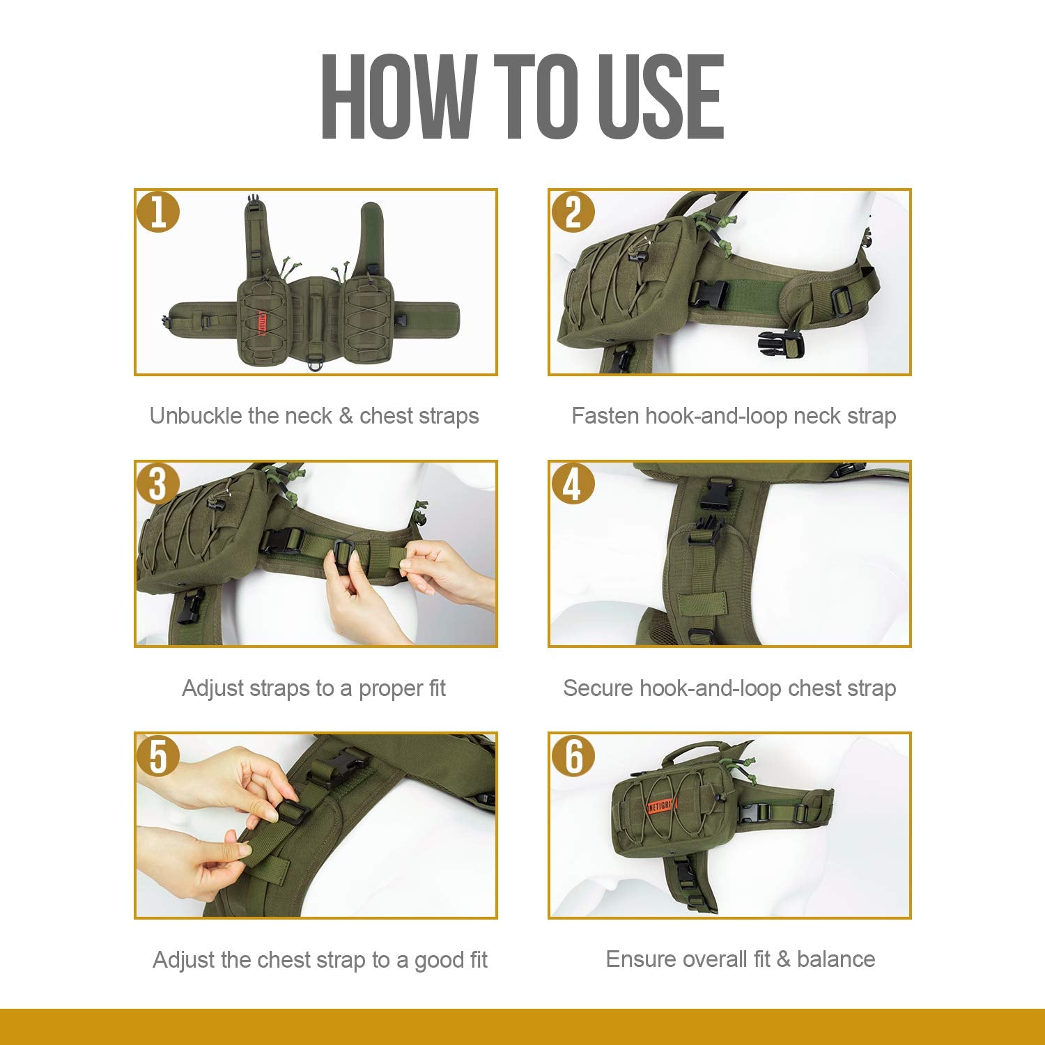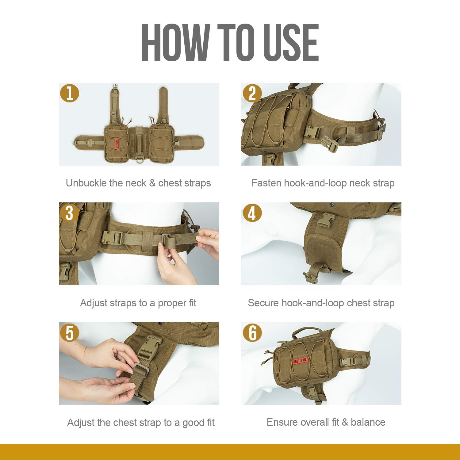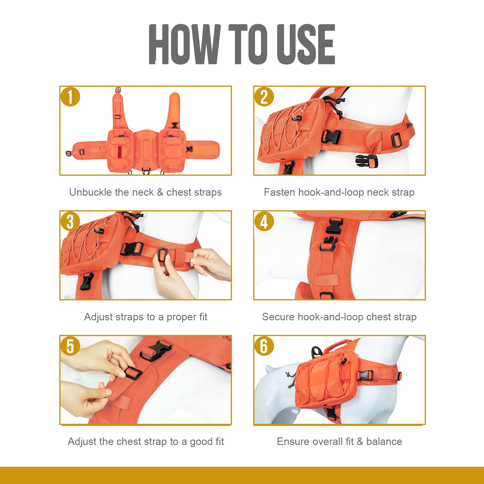 - Adjustable Dog Harness Backpack: Hook-and-loop belly strap with UTX-Duraflex buckles so the pack stays in place and wrap dog's neck & belly around well